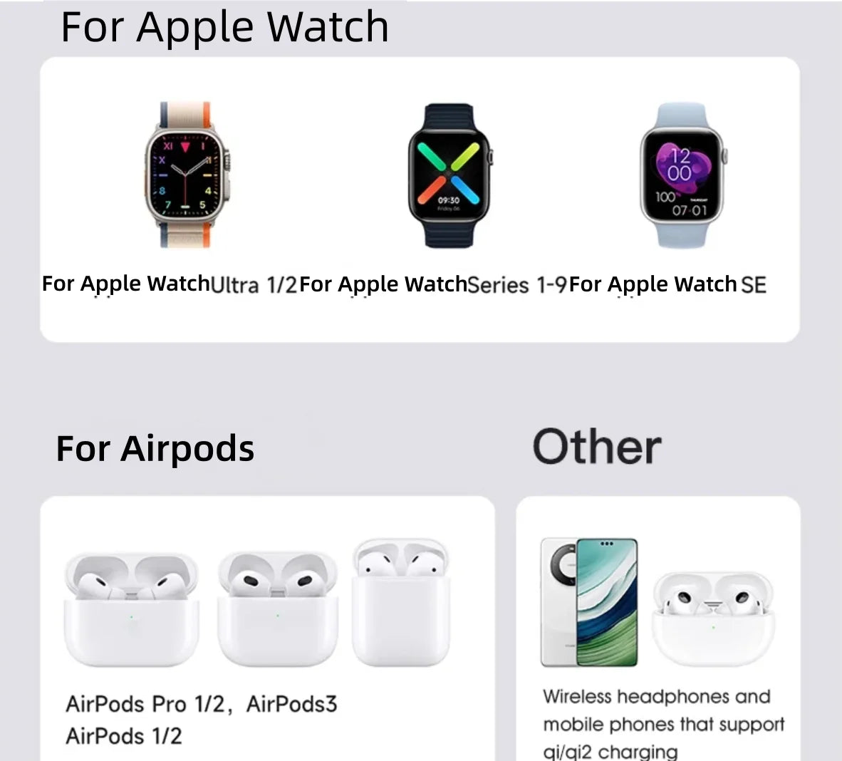 This charger is designed to work seamlessly with Apple iPhone, iWatch, and Airpods, offering a convenient charging solution for multiple devices.