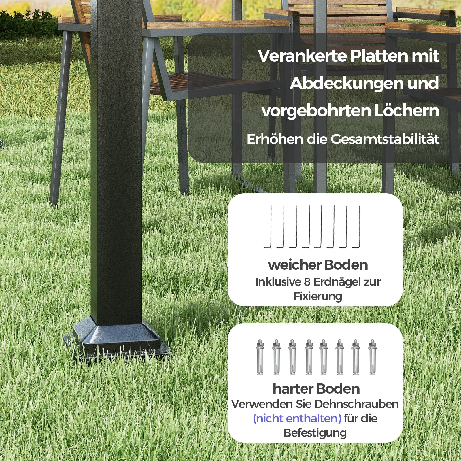 Our 310x310 cm outdoor pergola offers a 9.5-sized stand area that is ideal for enjoying outdoor entertainment with your family and friends. She features an extendable canopy that provides ideal shade and protection in changing weather conditions. In addition, the canopy is made of high-quality polyester fabric and provides reliable protection from the elements. Thanks to its thick support columns and 4 reinforced corner panels, this pavilion offers unprecedented longevity and stability. With its unique and elegant appearance, it also adds a touch of charm and style to your outdoor living space.
