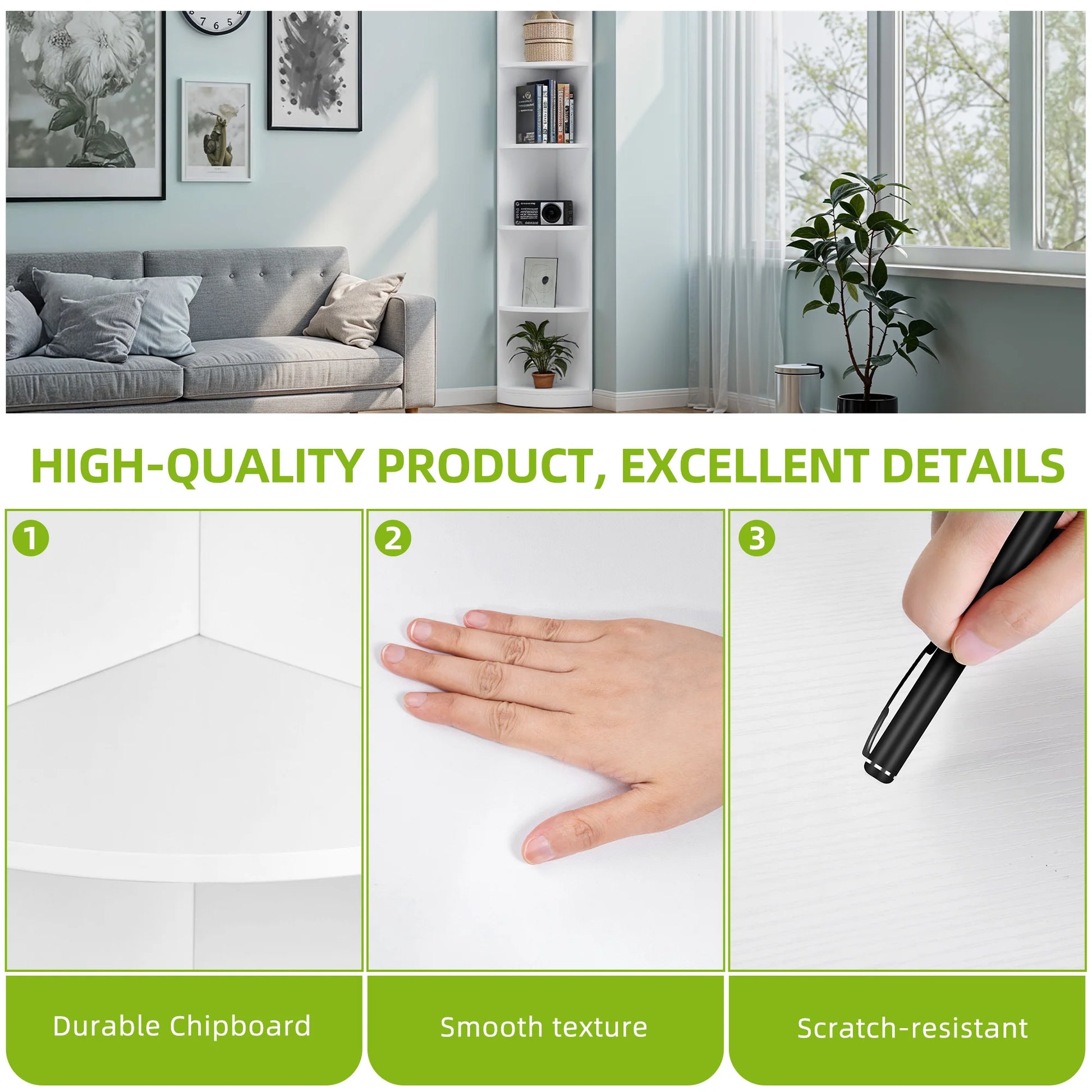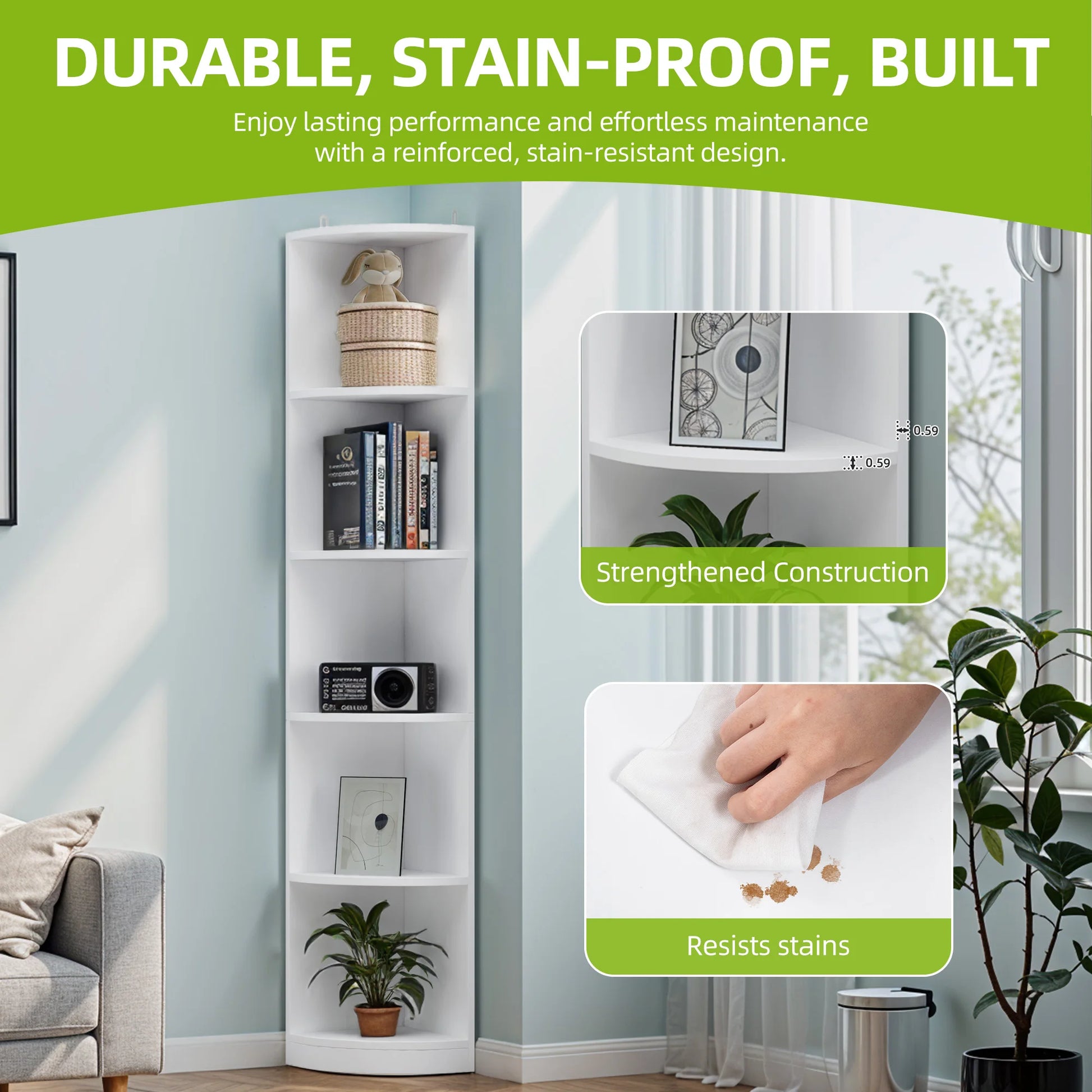 INCREASED STABILITY AND DURABILITY Made of reinforced MDF boards, a corner shelf is very sturdy and durable. A painted surface can withstand significant moisture and scratches and is easy to clean. Anti-slip feet help keep the bookcase stable on uneven floors.