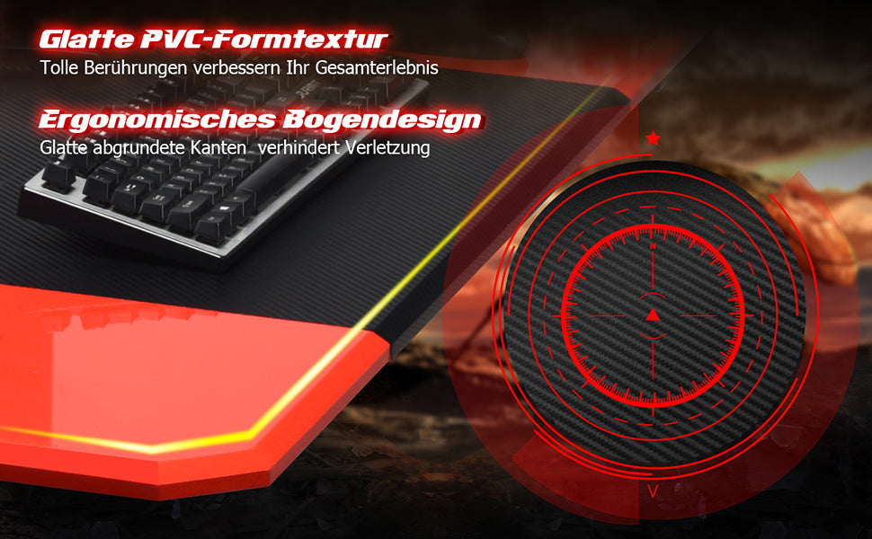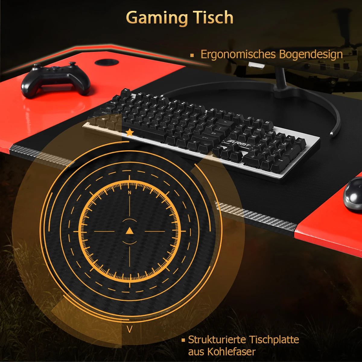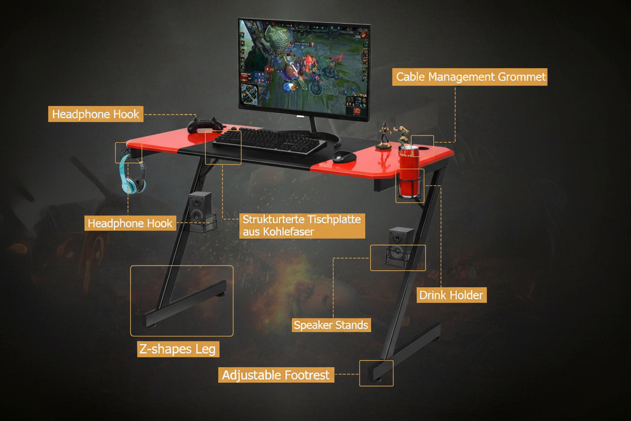 Are you currently establishing yourself in the gaming scene and want to achieve goals in eSports leagues? Our gaming table can optimally support you here! With its sturdy metal scaffolding and MDF panels as well as the equipment with a mug holder, A hook for your headset and two stands for boxing, our gaming table allows you a perfect and comfortable gaming experience. The tabletop offers spacious space for your monitors, keyboard, mouse and other equipment. In addition, the stable Z-shape of the frame and the smooth surface made of carbon fibers offer a comfortable sense of use. The table can also be used as a desk for writing texts and reading. It can also be easily cleaned only with a damp cloth and can be assembled in a very short time. This table can perfectly support you to fully enjoy your games and achieve the desired success and significantly increase the fun of gaming.